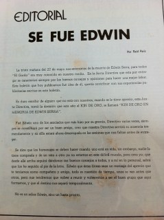 En 1978, algún día de algún mes, este fue el editorial del boletín de la AGPG. Era un homenaje póstumo a mi papá. Su muerte reciente todavía resultaba increíble. El tema central de la edición era el Kin de Oro, que se llamó “Kin de Oro en Memoria de Edwin Serra.”
