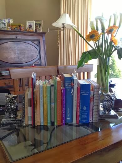 Los libros de poesía, que antes nadaban como en pecera sobre el cristal de la mesa de flores, ahora son un pelotón franqueado por la custodia de dos búhos vigilantes, uno de cada lado. Parece mentira, pero se ven ordenados.