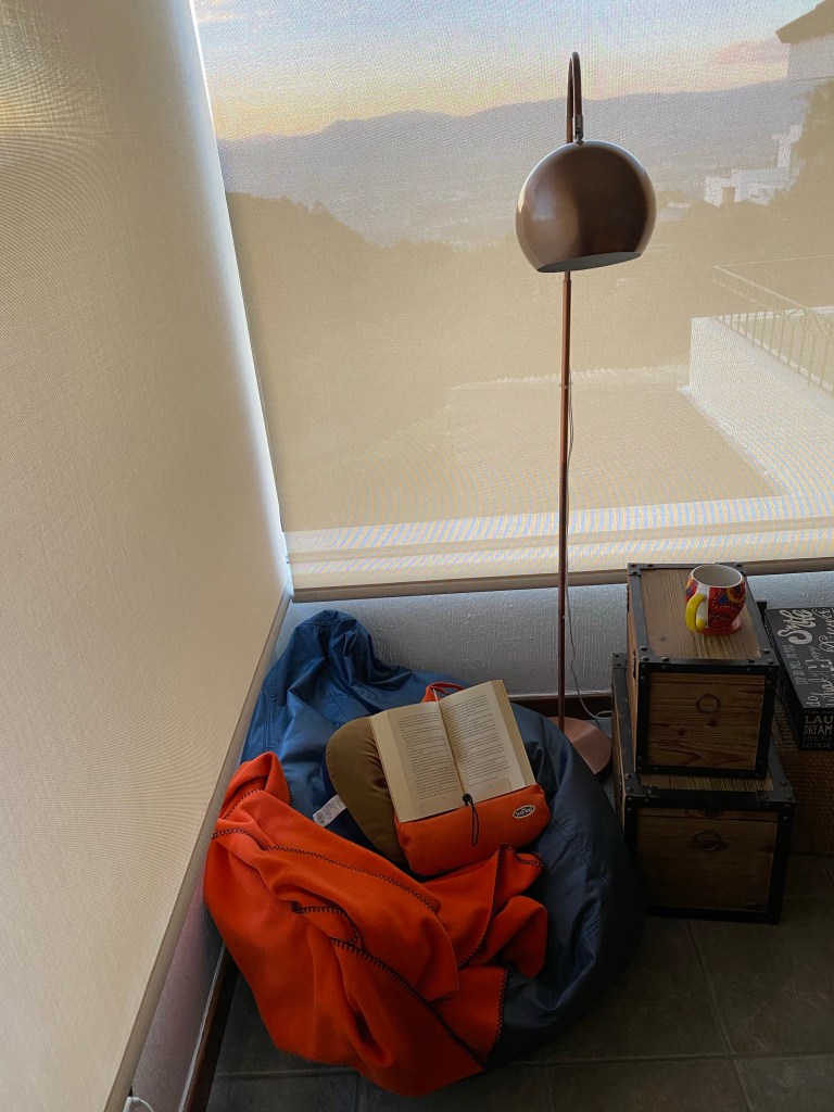 Un bean bag muy viejo que tras dos horas de sostenerme cede al peso y me aplana el trasero. Una lámpara como farol, para iluminar las sombras que cubren mi esquina. Una chamarrita anciana —suelo sentir todo tipo de frío.