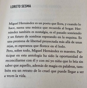 Leer su poesía es enjugar su llanto, comprender que vaticinaba su muerte, es oler la sangre de sus heridas. Pero también es saberlo enamorado, es encontrar los labios que le inspiraron, es acompañarlo en el dulce acto de besarlos. Es, dentro de sus versos, compartir de una boca la misma humedad. Leerlo es defender en un valls a los enamorados condenados, incendiar el cuerpo de su mujer durante la noche y llorar en sus nanas al hijo que no llegó a conocer.